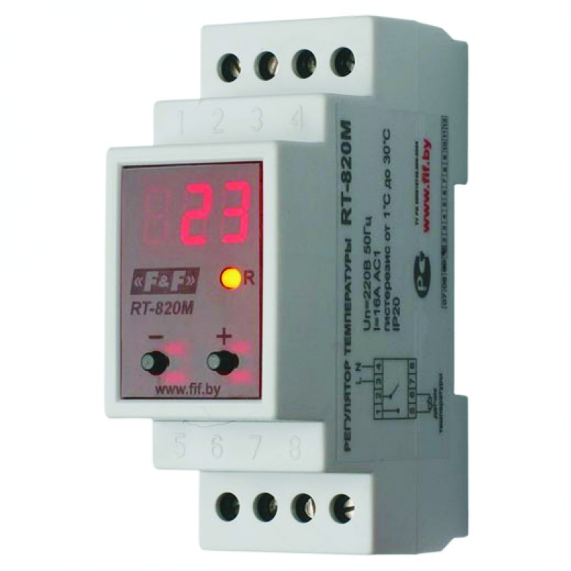 Регулятор температуры RT-820M  предназначен  для контроля и поддержания заданного температурного режима в помещениях, овощехранилищах, системах водяного отопления и  т .п.  путем  включения/выключения  нагревательной  или  охлаждающей установки по сигналам выносного датчика температуры.