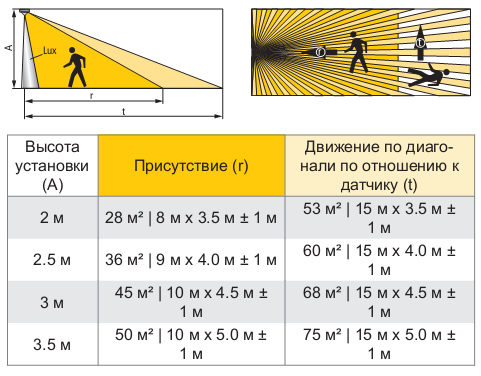 Зона обнаружения 14х4 м (высота 2,5 м), 15х5 м (высота 3 м).